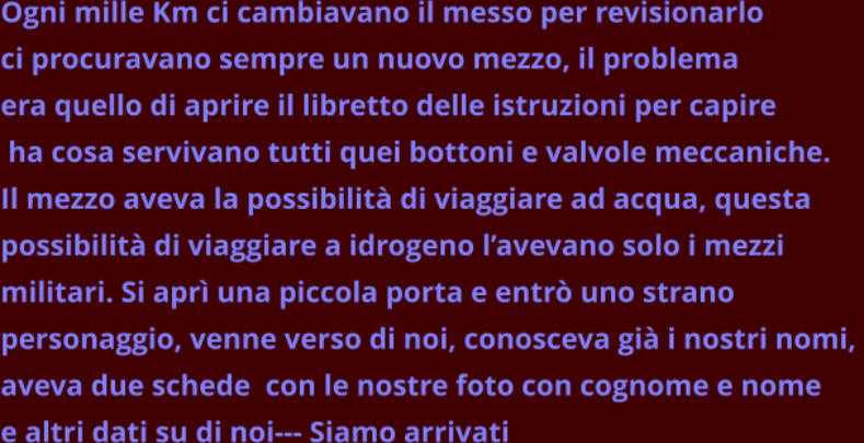 Ogni mille Km ci cambiavano il messo per revisionarloci procuravano sempre un nuovo mezzo, il problemaera quello di aprire il libretto delle istruzioni per capire ha cosa servivano tutti quei bottoni e valvole meccaniche.Il mezzo aveva la possibilità di viaggiare ad acqua, questa possibilità di viaggiare a idrogeno l’avevano solo i mezzi militari. Si aprì una piccola porta e entrò uno strano personaggio, venne verso di noi, conosceva già i nostri nomi, aveva due schede con le nostre foto con cognome e nome e altri dati su di noi--- Siamo arrivati